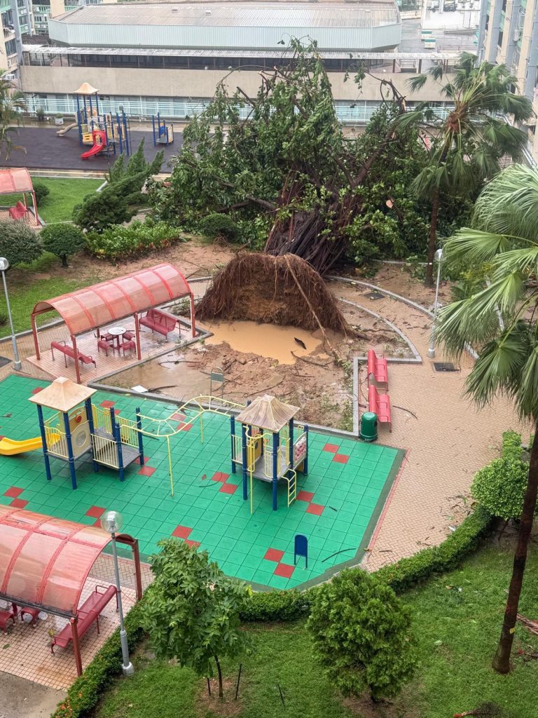 然而,颱風樺加沙的怒吼,終於打破了這份寧靜。那一夜,風如野獸般咆哮,樹幹在劇烈的搖晃中傾斜,根系被連根拔起,轟然倒下。遊樂場旁的空地上,只剩斷枝殘葉,散落一地綠色的遺憾。居民們醒來時,目睹這一幕,心如刀絞。「這棵樹那麼美那麼大,好可惜啊!」有人在社交平台上感慨;「它熬過了那麼多颱風,這次卻撐不住了,好傷心!」另一位鄰居嘆息。更多人則懷著不捨,喃喃道:「希望能救回這棵老樹,細葉榕的生命力很強的。」是的,不捨如潮水湧來,因為這不僅是一棵樹的倒下,更是半世紀情感的崩塌。那陪伴的影子,那守護的蔭涼,那帶來的溫情,都在風中消逝,讓人忍不住回首,淚眼婆娑。